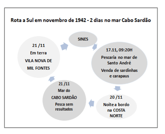 – Dia 21, sábado: “paçamos para o Sul pescamos no Sardão não fisemos nada fui para Mil Fontes estive em terra almocei a bordo saímos para o mar as 4 ½ da tarde viemos fiquar a Sines”